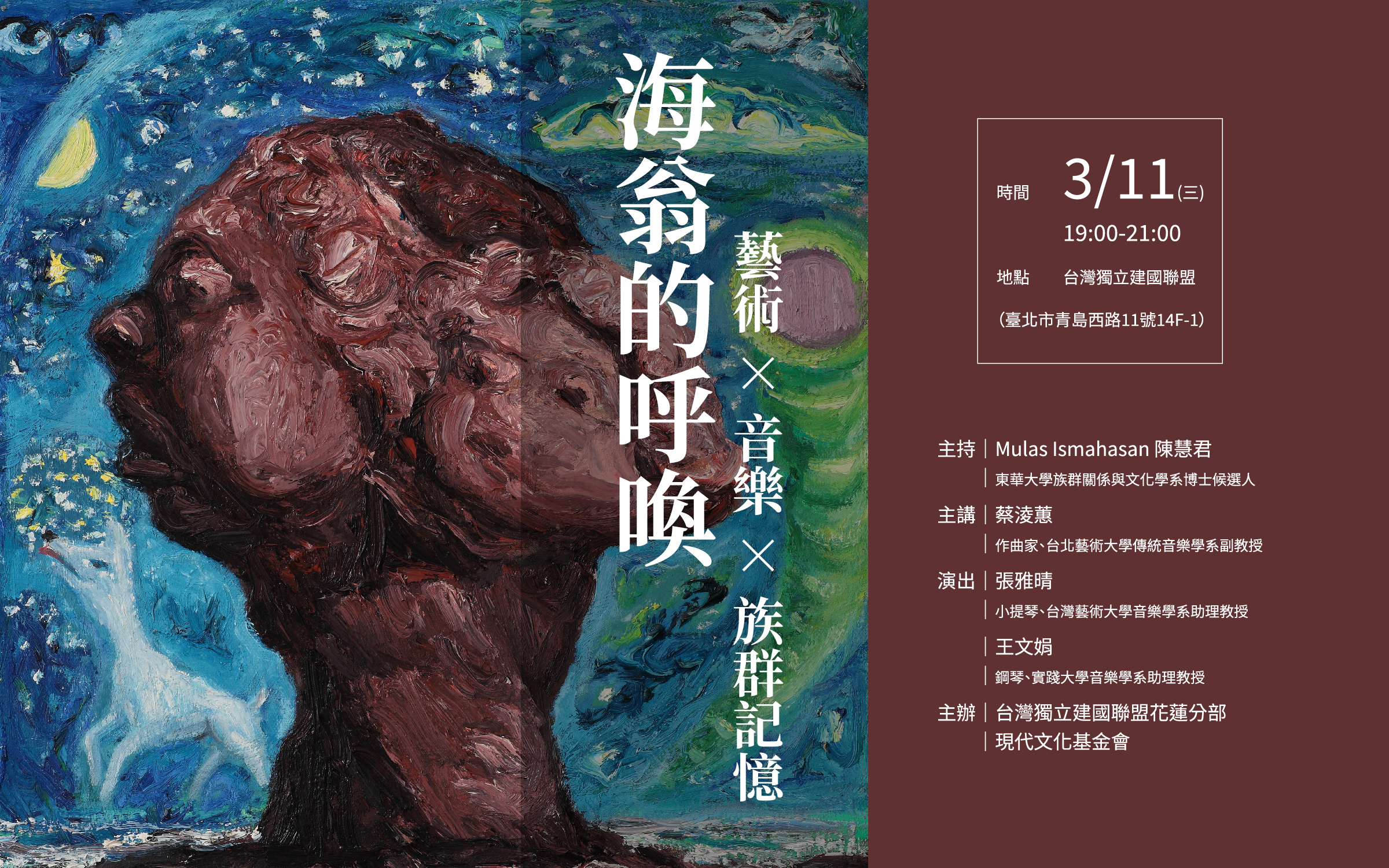 2026-02-26 海翁的呼喚:古謠、畫作與小提琴的交會這是一場關於文化記憶、族群生命與世代傳承的藝術 × 音樂對話活動。當記憶被傳述,族群被看見,屬於這塊土地的真實樣貌,才能被尊重,也才能被真正理解。