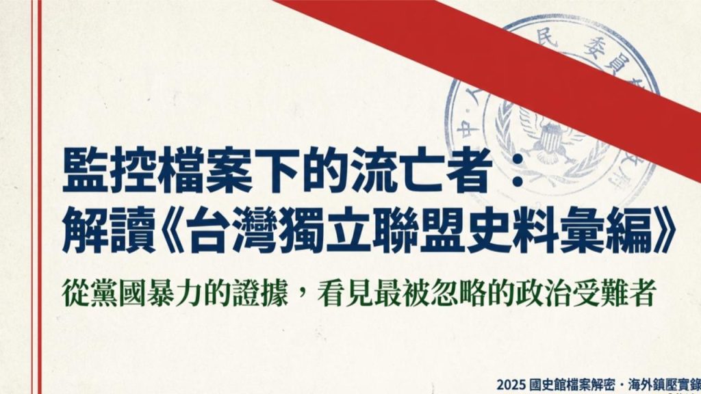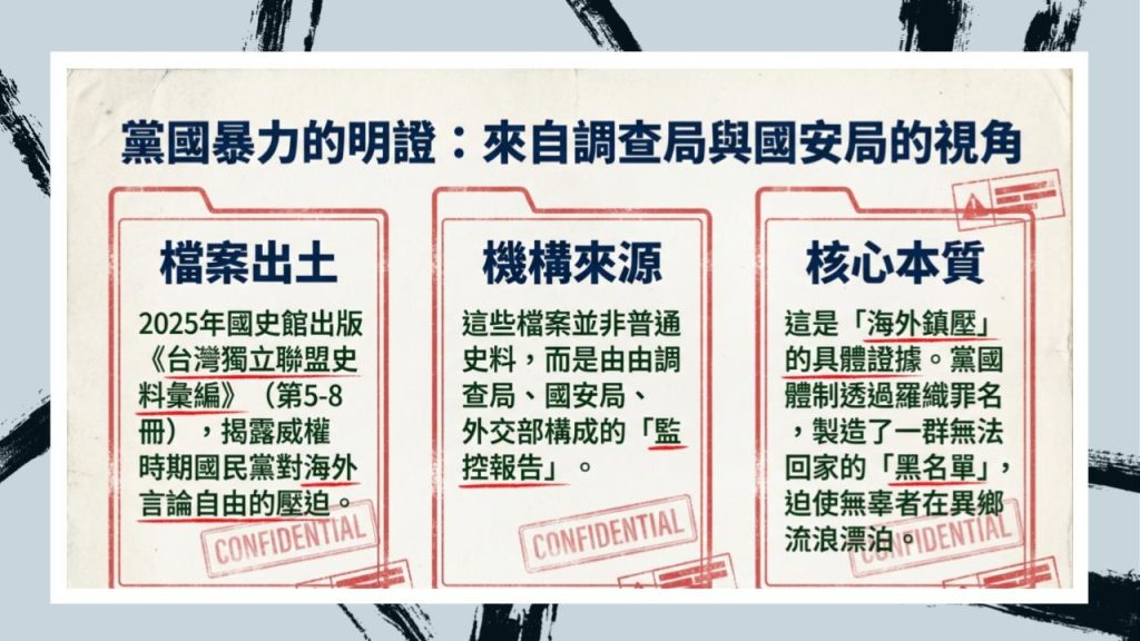 2025 年國史館出版《台灣獨立聯盟史料彙編》(5-8冊),這些「史料」與前四冊一樣,是由「監控檔案」所構成,其來源是調查局、國安局、外交部。這些監控檔案是黨國不分,國民黨威權統治下,「海外鎮壓」的明證。因為這樣的「黨國暴力」讓許多主張台灣獨立或是無辜被羅織罪名的人,成為無法回家的「黑名單」,被迫在異鄉流浪漂泊。