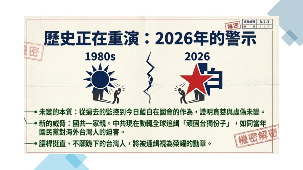 對於中國國民黨統治下的黨國體制對台灣人民的集體迫害,也不應該用一句「國民黨本來就這麼壞」而輕輕放過。國民黨不僅在黨國戒嚴時期監控迫害者台灣人,到目前 2026 年為止,從藍白在國會的胡作非為來看,歷史不但會重演,更證明貪婪虛假如國民黨,可從來沒要放過台灣人!