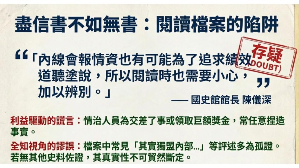 因此,閱讀這份中國國民黨的黨國「監控檔案」史料,就如同國史館陳儀深館長所說的「內線會報情資也有可能為了追求績效,道聽塗說,所以閱讀時也需要小心,加以辨別。」(p.1)。因此,如果根據監控檔案所提供的描述,必須存疑,不應該以孤證貿然斷定,如〈導言〉提到「其實獨盟內部…」(p.21) 這一段僅使用調查局作為監控者的評述資料,其內容「真實」待考,卻使用了「其實」。
