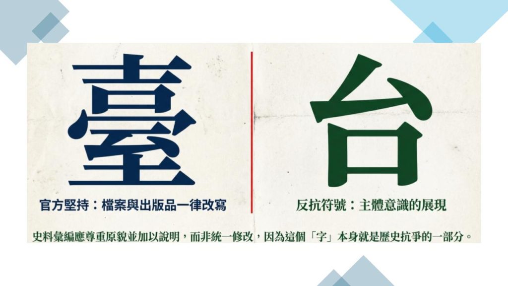 其中「台灣獨立聯盟」使用的是「台而不是臺」。名從主人,國史館應該基於史料精確性沿用團體名稱,而非一律改為「臺」。