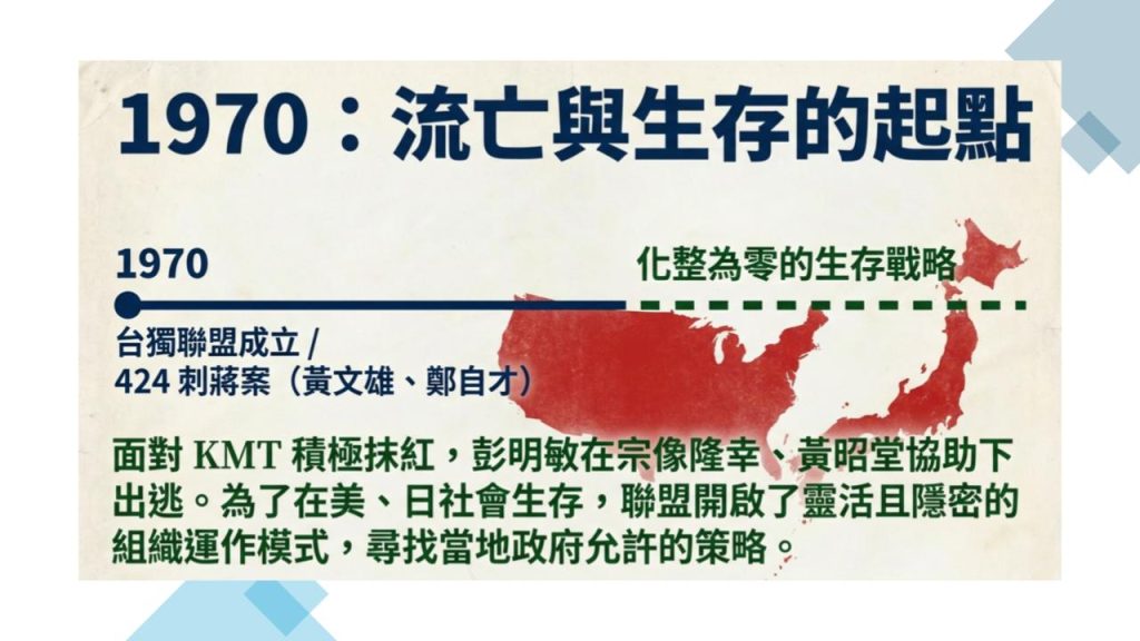 就〈導言〉所提到組織的沉寂、分裂、重組,看起來有道理,不過如果我們放在更大的視角來看,1970年台獨聯盟成立、日本盟員宗像隆幸、黃昭堂等協助彭明敏出逃,乃至盟員黃文雄、鄭自才(時為台獨聯盟執行秘書)秘密規劃的 424 刺蔣案,KMT積極抹紅台灣獨立聯盟,台灣獨立聯盟為在美、日等國的社會生存,也勢必要摸索出該國政府允許的策略和組織模式。