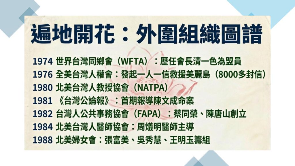 如世界台灣同鄉會(1974)的成立,同時盟員有意識發展更多在地同鄉會,2008 年之前的世台會會長清一色為台獨聯盟盟員;全美台灣人權會(1976)曾發起一人一信救援美麗島大審政治犯,高達 8000 多封等;北美台灣人教授協會(1980);《台灣公論報》(1981)正式出刊就是以陳文成命案為第一期;台灣人公共事務協會(1982)由世界性台獨聯盟第一任主席蔡同榮和陳唐山共同創立;北美台灣人醫師協會(1984)則是由周烒明醫師主導;北美洲臺灣婦女會(1988)則由張富美、吳秀慧、王明玉等人籌組。
