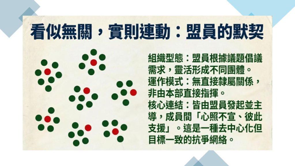 台獨聯盟的盟員有意識地根據議題倡議、組織型態之必要,靈活地形成不同團體,這些團體,並非由台獨聯盟本部直接指揮,沒有組織上的直接隸屬關係,但因為由台獨聯盟盟員發起繼而主導,因此盟員之間都會心照不宣、彼此支援。