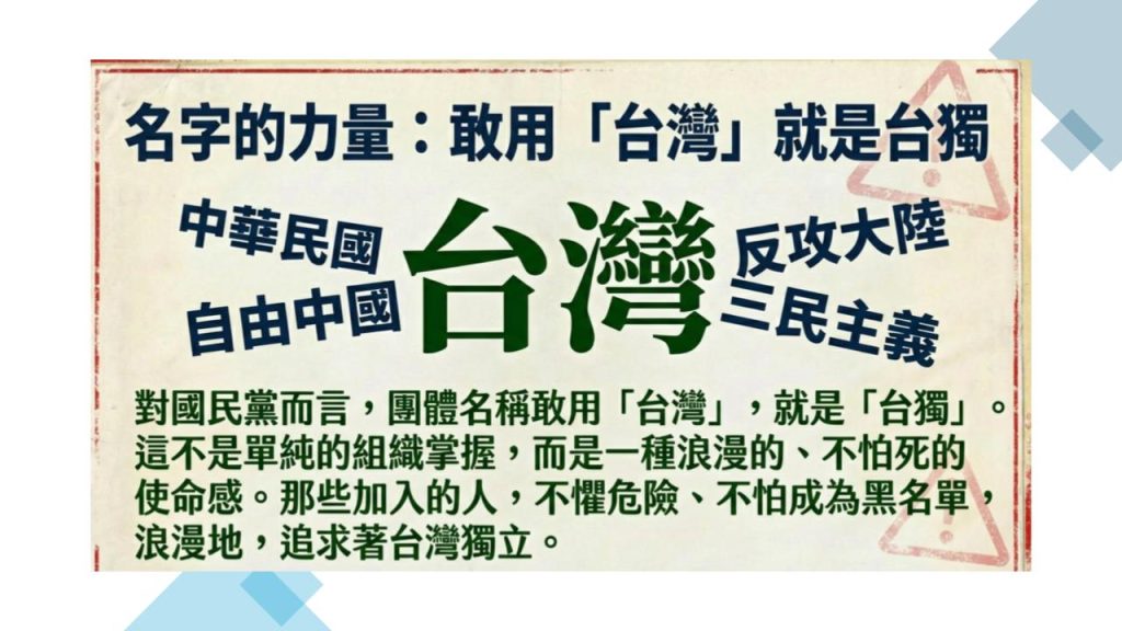 因此,這些目前看起來稀鬆平常的「台灣人」社團,當時對國民黨卻是芒刺在背,因為這些團體都是不願屈服於中華民國外來政權體制,以「台灣」為名,證成自身主體意識。