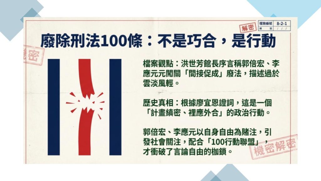 洪世芳館長清楚指出「郭倍宏、李應元等闖關回臺後被捕,引起社會關注廢除刑法第一百條的議題,間接促成『廢除刑法一百條』運動…」這樣的「間接促成」看似雲淡風輕,建議不妨進一步參考當時發動100行動聯盟的關鍵人物,台教會創會秘書長廖宜恩的證詞,廢除刑法一百條運動,這是一個計畫縝密、裡應外合的政治行動。